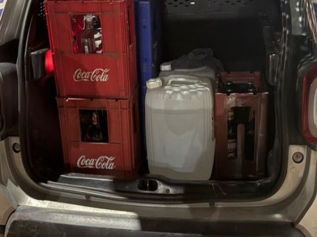 Foi realizado acompanhamento e, durante as buscas, em um barraco, foram encontrados aproximadamente 120 litros de loló, distribuídos em galões e garrafas.
